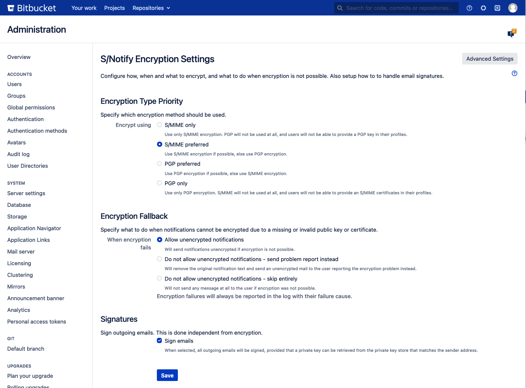 Note that, independent from what you select here, the reason for the encryption failure is always documented in the Bitbucket log file.
