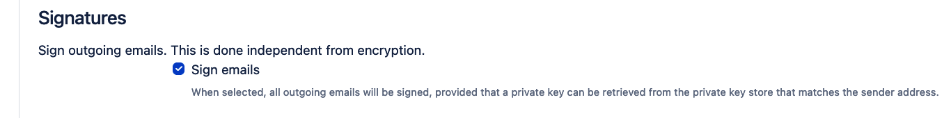 When selected, S/Notify will attempt to sign all outgoing emails using an appropriate PGP key or S/MIME certificate retrieved from the key store(s) provided in Server Key Management. The PGP key or S/MIME certificate must be issued for signing purposes as well as for the sender email address. This is the email address configured under Mail Servers.