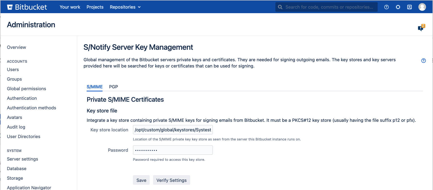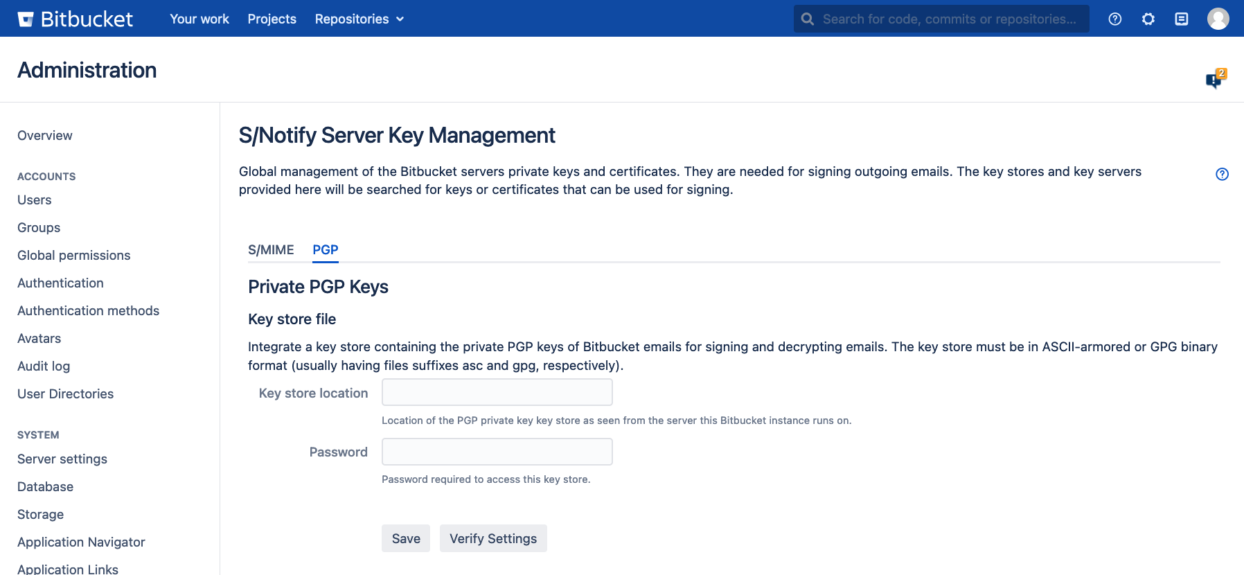 Under this section, the private PGP keys and S/MIME certificates of the Bitbucket server are managed. They are used for signing outgoing emails.