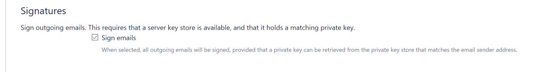 When selected, S/Notify will attempt to sign all outgoing emails using an appropriate PGP key or S/MIME certificate retrieved from the key store(s) provided in Server Key Management. The PGP key or S/MIME certificate must be issued for signing purposes as well as for the sender email address. This is the email address configured under Mail Servers.