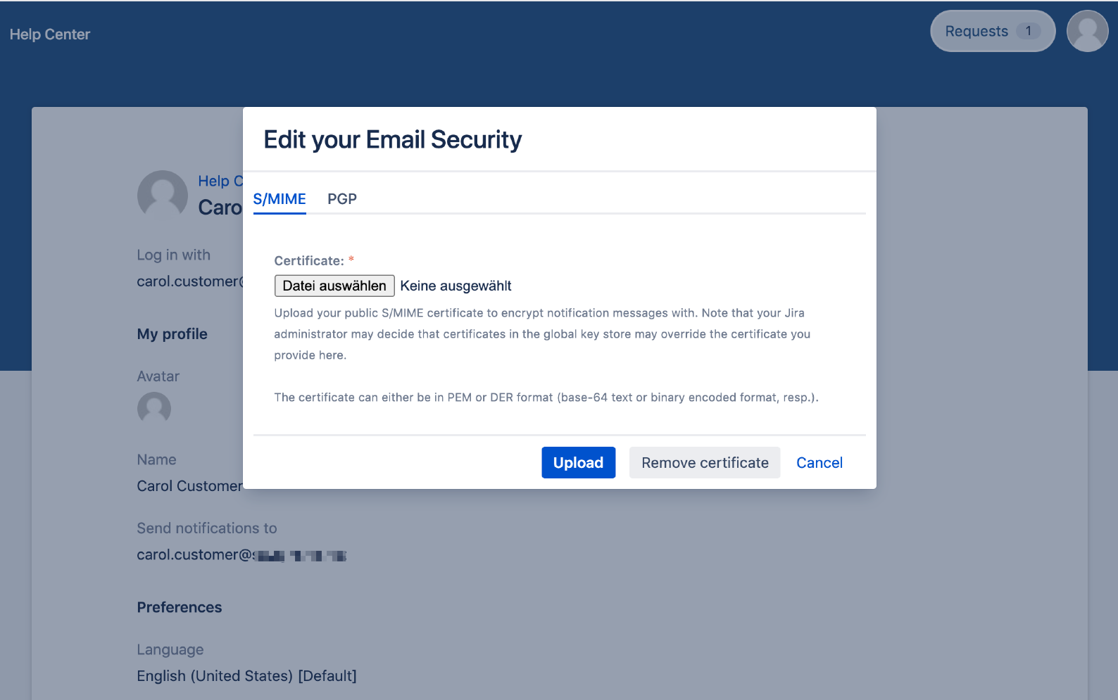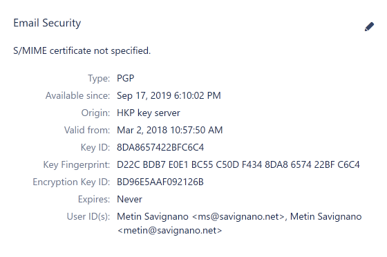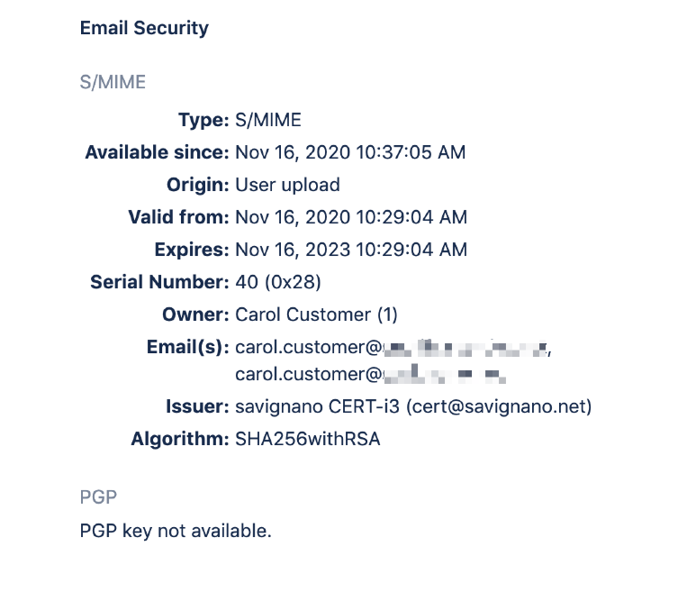 Prior to release 3.3, JSM customers could not view or upload their S/MIME certificates or PGP keys.