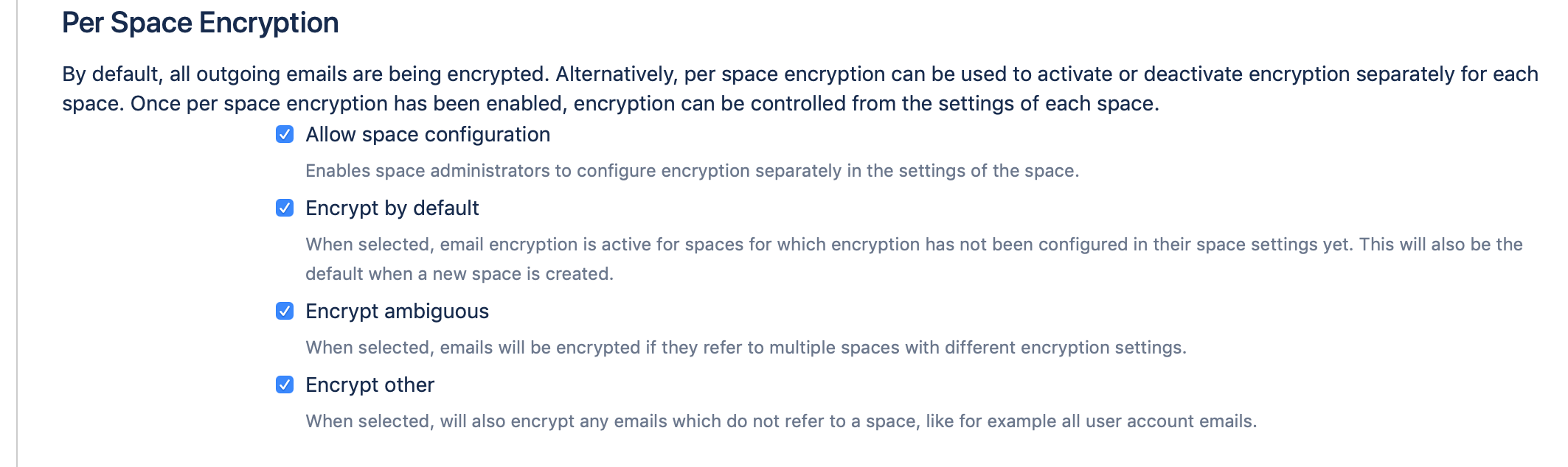 This setting specifies what to do for spaces that have not configured email encryption yet. This applies to all spaces when you activate per space configuration for the first time, as well as to all spaces that are created after that. When selected, emails referring these spaces will be encrypted, otherwise they will be sent unencrypted.