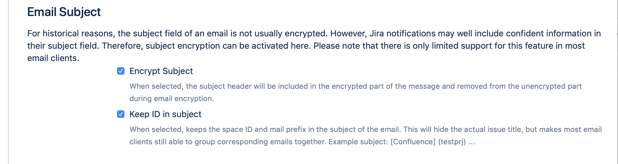 Due to the weak client support for encrypted subjects, clients that organize emails in threads using the email subject will fail miserably because all email subjects look identical. To re-enable the thread view in clients without exposing too much information, this option will keep the Confluence prefix and space ID in the subject (but the title will still be removed), so email clients can still provide a correctly threaded view.