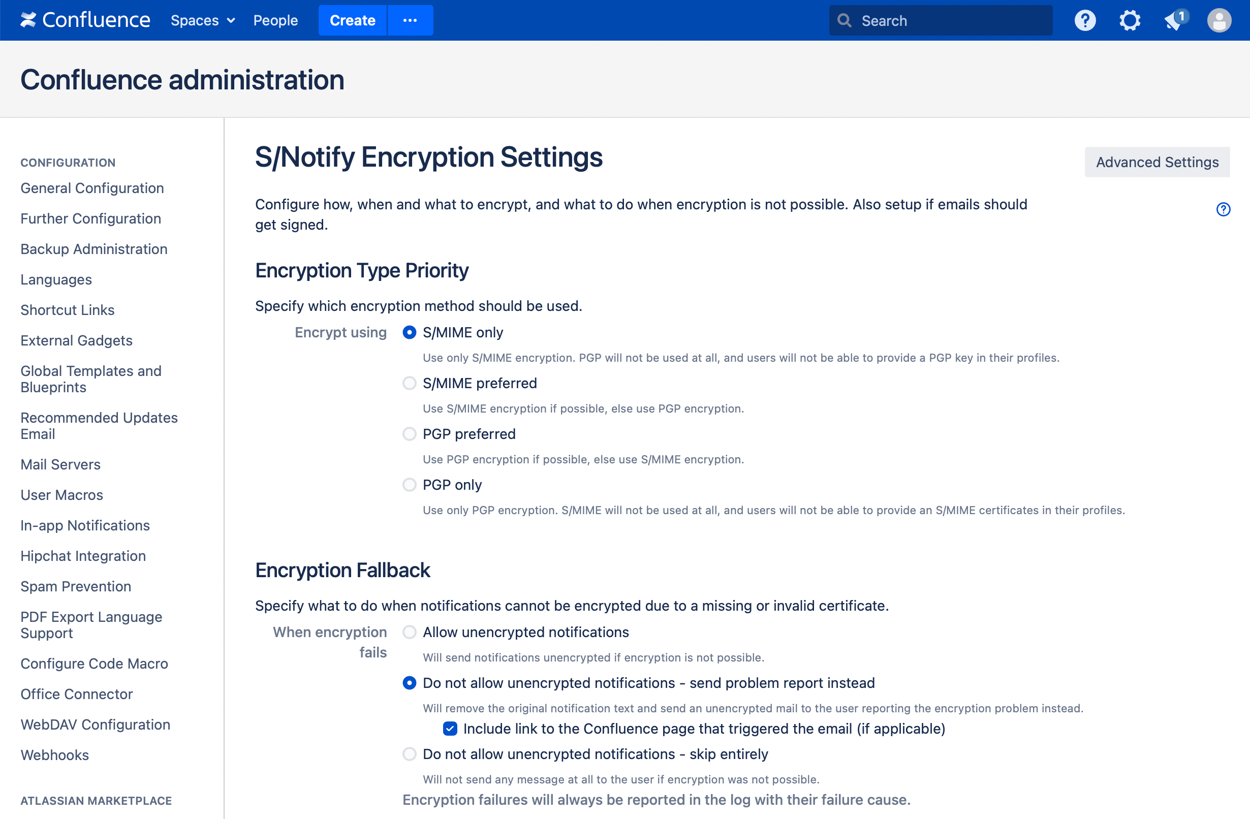 Use this option, if you have setup S/Notify with all required certificates, and you do not even want any encryption problem warnings to be sent unencrypted. Be aware that, in this case, it is strongly advised to monitor the Confluence log file for encryption failures, to make sure they do not go undetected.