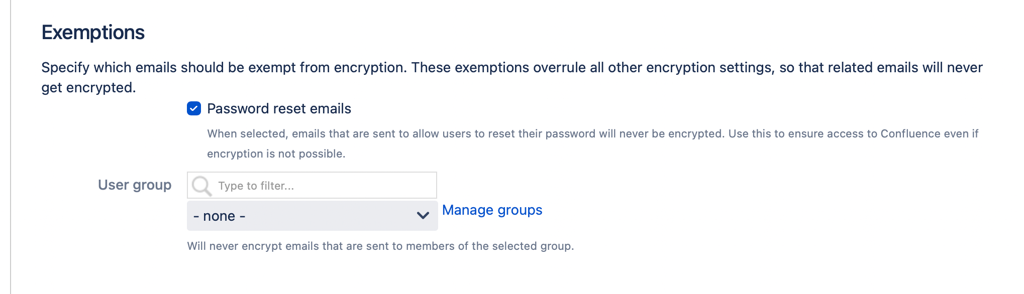 When enabled, emails that are sent to users to recover access to Confluence will always be sent unencrypted. Use this if your users should be able to reset their password in Confluence. Note that this might not be useful if user credentials are managed outside of Confluence.