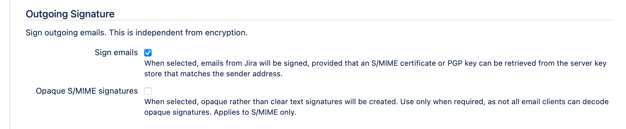 When selected, S/Notify will attempt to sign all outgoing emails using an appropriate PGP key or S/MIME certificate retrieved from the key store(s) provided in Server Key Management. The PGP key or S/MIME certificate must be issued for signing purposes as well as for the sender email address. This is the email address configured under Mail Servers.