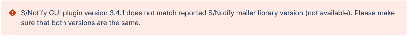 When clicking Get Started from the S/Notify app entry in Manage Apps, or upon display of one of the S/Notify configuration pages, a library version mismatch is reported: