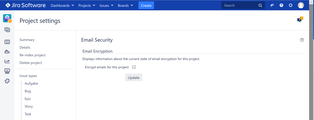 The detail page displays information about the current encryption setting for this project. If the Jira administrator has allowed per project configuration, a project administrator can switch on or off encryption for the project from here.
