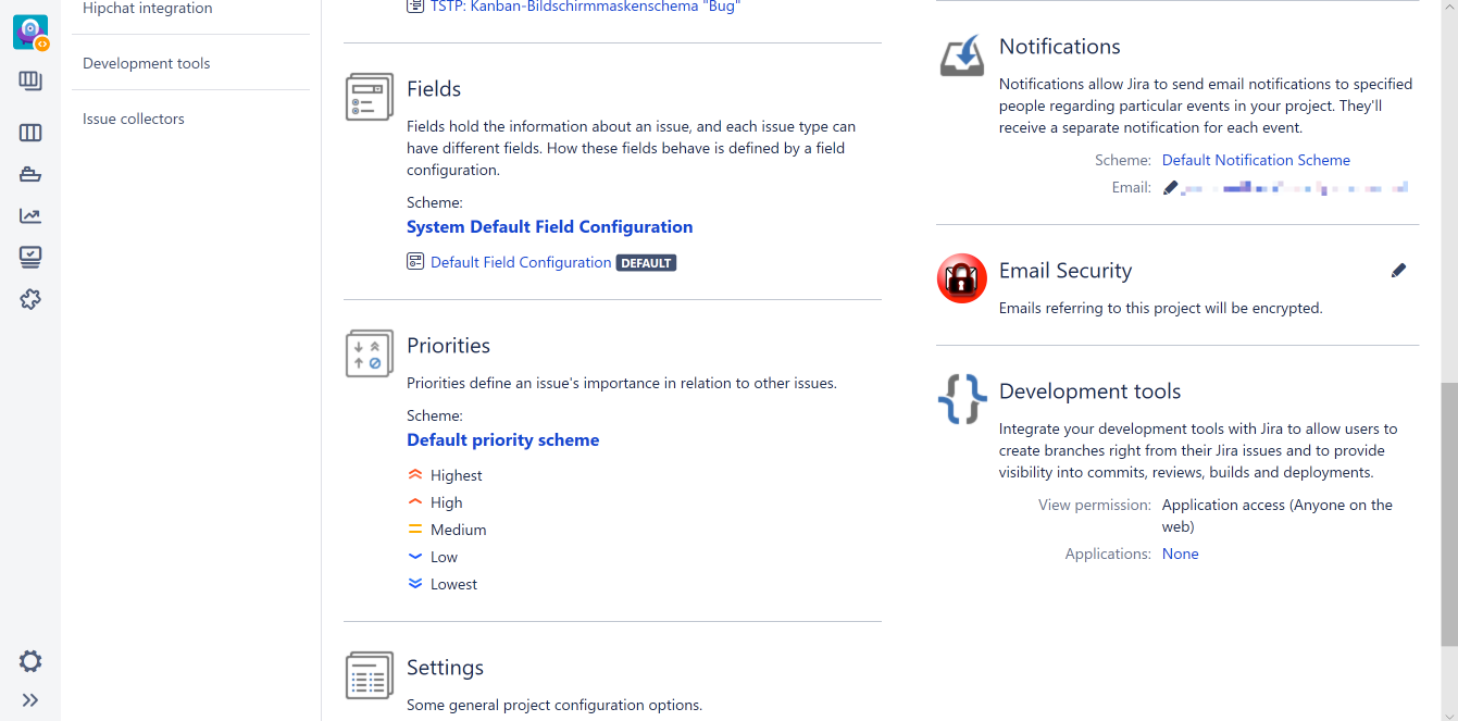 It displays information about the email encryption settings applied to this project's notifications. If the Jira administrator has allowed per project configuration, the edit symbol can be hit to change the encryption setting for this project.