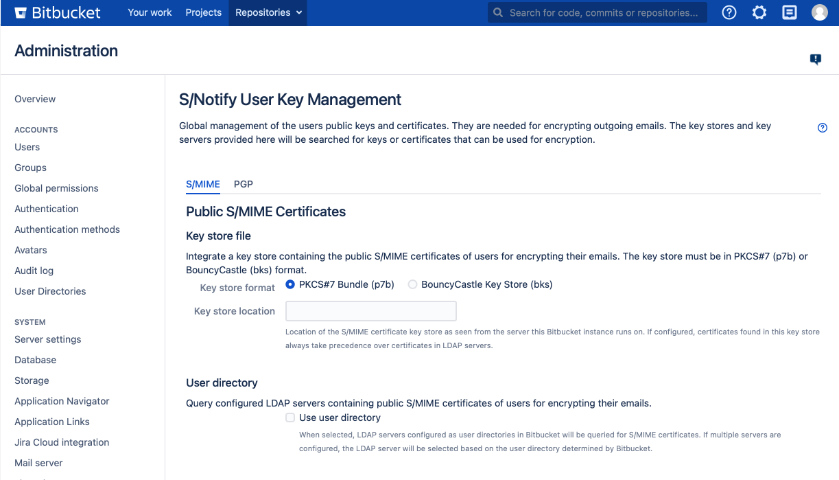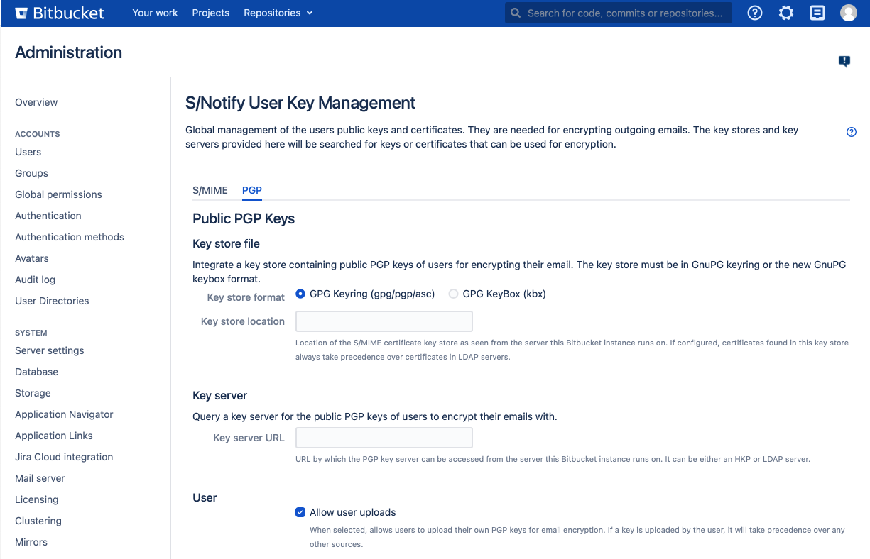 Under this configuration entry, the public PGP keys or S/MIME certificates for Bitbucket users are managed. They are used for the encryption of outgoing emails.