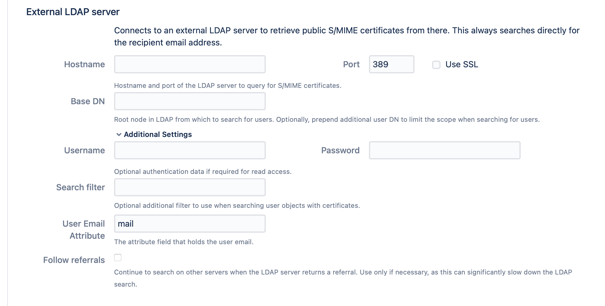 Note that, in order to retrieve a user's S/MIME certificate, their email address needs to be sent to the server. If the LDAP server is outside your company's own infrastructure, you may be required to inform your users about this use of their email address, depending on your and/or your users jurisdiction. Legislation around personal identifiable information (PII) varies across different jurisdictions (GDPR, HIPAA, PCI etc.), so please check what applies in your case.