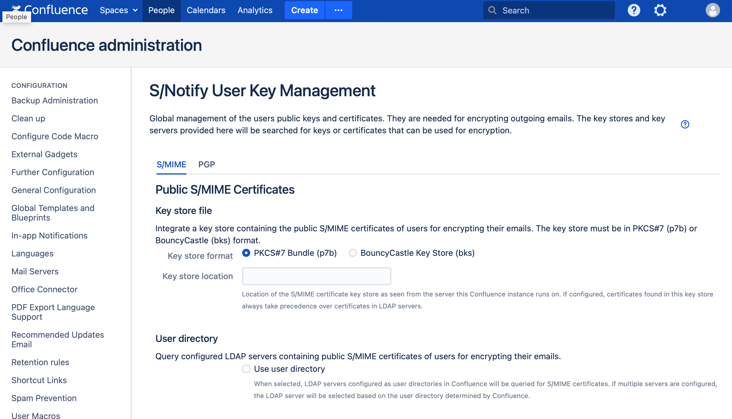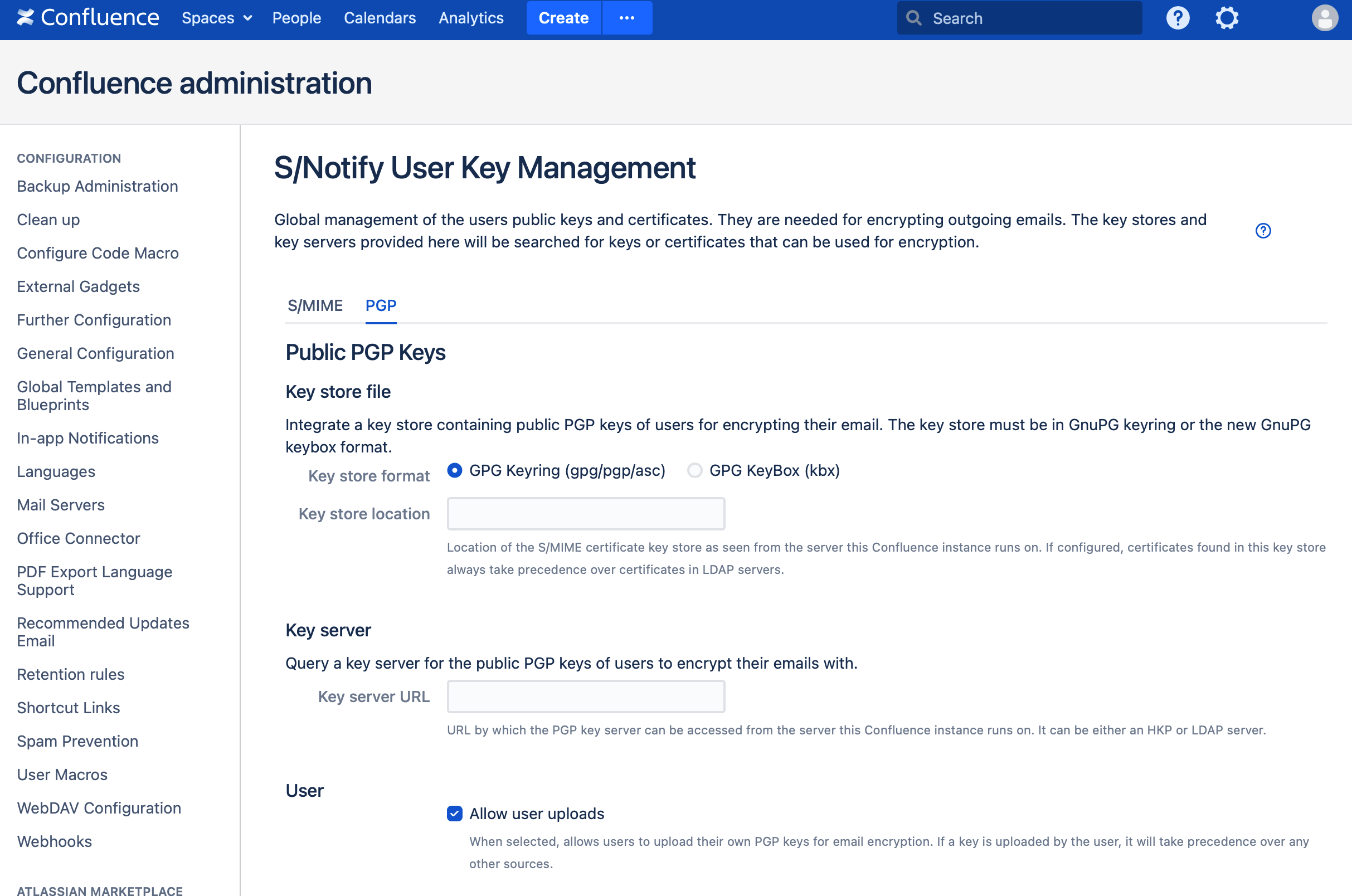 Under this configuration entry, the public PGP keys or S/MIME certificates for Confluence users are managed. They are used for the encryption of outgoing emails.