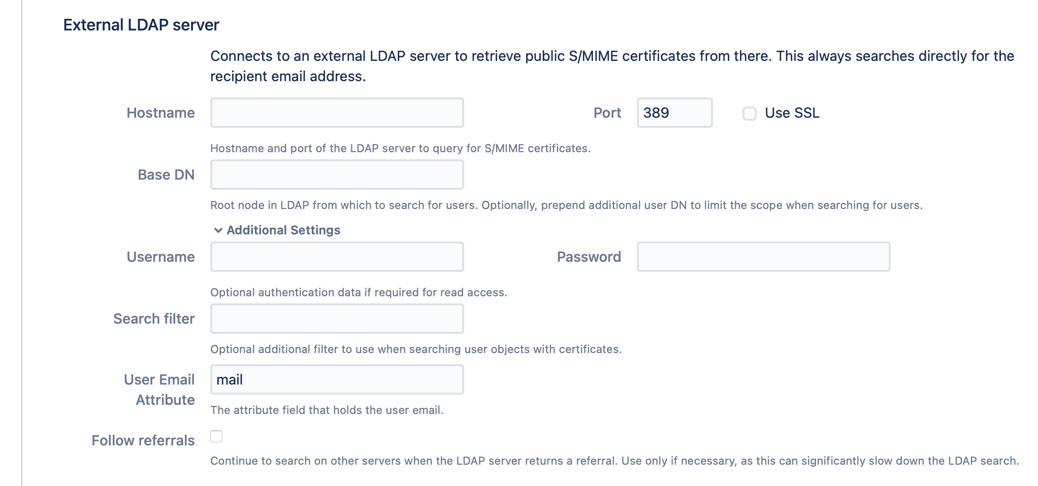 This setting requires that an LDAP server is used as a Confluence user directory, and that the user is found in this directory. S/Notify will then query the user's S/MIME certificate from the LDAP server in the following order and format: