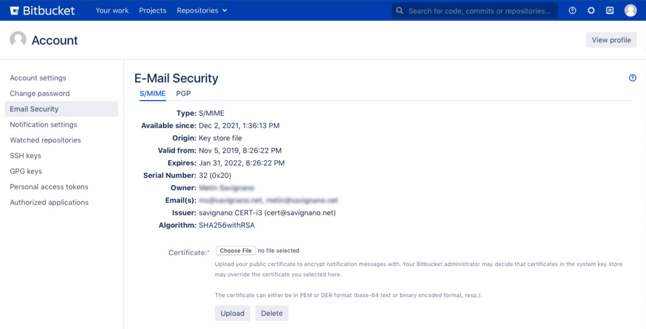 To upload an S/MIME certificate, make sure you select S/MIME, then provide an S/MIME certificate file in PEM or DER format to upload.