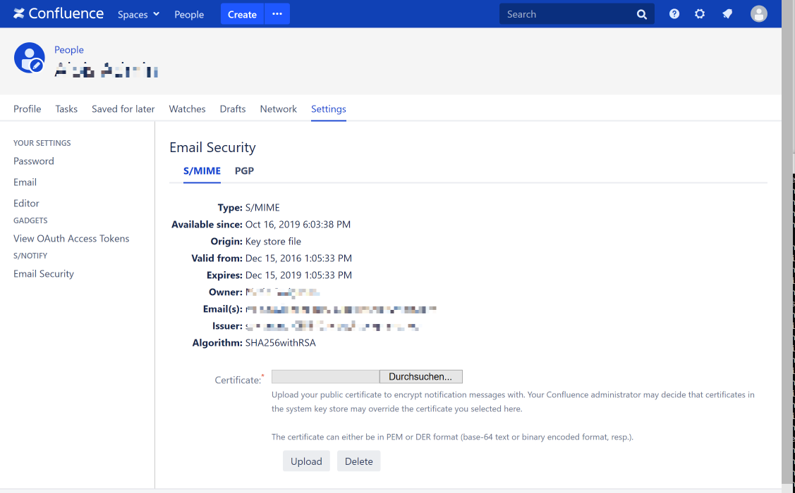 In each user's profile, S/Notify adds a section for Email Security that displays information about the selected S/MIME certificate and/or PGP key, if available yet. To display the S/Notify section in the user profile, select Profile from the user menu (top right), then click on Settings at the top, and finally select Email Security on the left.
