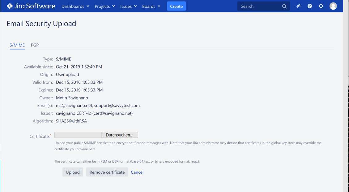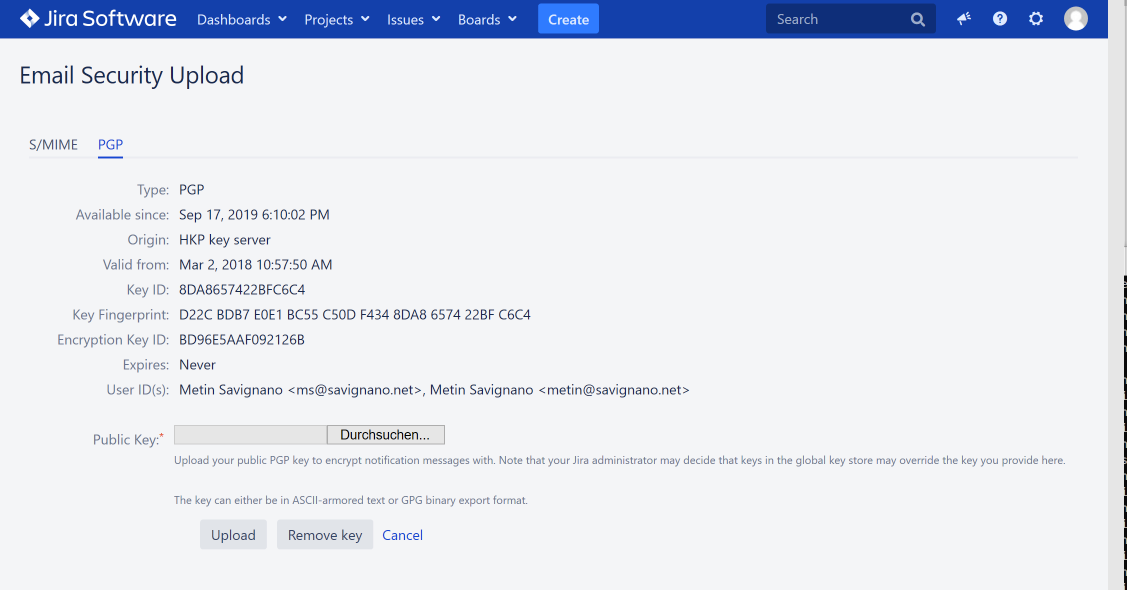 Users can display and optionally manage their own public S/MIME certificate and/or PGP key that is used for encrypting emails sent to them. The upload option is only available if enabled by the administrator in User Key Management.