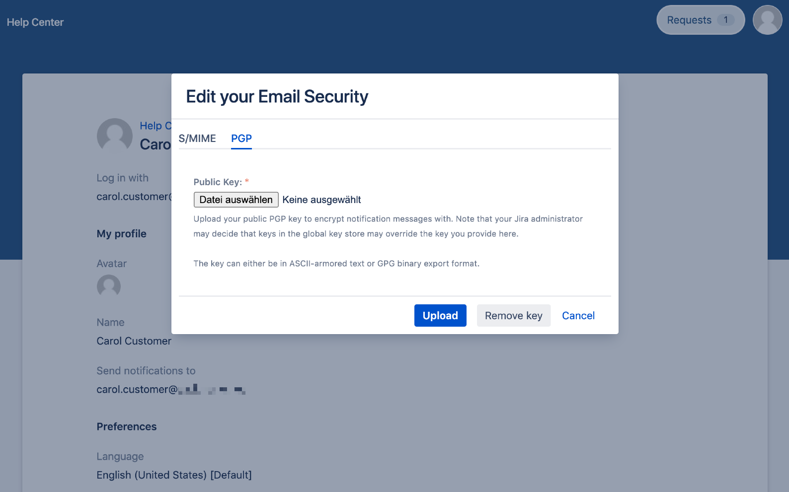 To upload a PGP key, click the Edit Email Security link. A popup will appear that allows you to upload a file or remove an existing key. Make sure you select PGP, then provide a PGP key file in ASCII-armored or GPG binary export format.